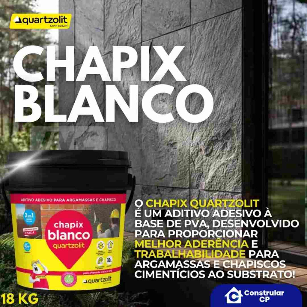 Chapix Blanco 18L - Quartzolit É um aditivo adesivo à base de PVA, desenvolvido para proporcionar melhor aderência e trabalhabilidade para argamassas e chapiscos cimentícios ao substrato! ::: CARACTERÍSTICAS E BENEFÍCIOS ::: - Chapiscos rolados e comuns - Alta aderência - Isento de cloreto, não agride a armadura - aplicação sobre concreto, alvenaria e bloco de EPS em tetos de lajes - Facilita a aplicação do chapisco rolado, reduzindo as perdas de material e a geração de sujeira na obra. - Diminui a retração e a permeabilidade de chapiscos e argamassas. - Aumenta a coesão das argamassas. - Reduz a fissuração em argamassas de revestimento. - Pronto para o uso. ::: DICAS APLICAÇÃO ::: - Evite a aplicação sobre as superfícies enquanto expostas diretamente ao sol pleno ou se houver risco de chuva. - Proteja peças de alumínio, pois podem ficar manchadas se atingidas no momento da aplicação. - Verifique suas ferramentas de trabalho. - Use EPIs ::: NÃO INDICADO PARA ::: - Superfícies pintadas. - Metal ou madeira. - Revestimentos orgânicos.